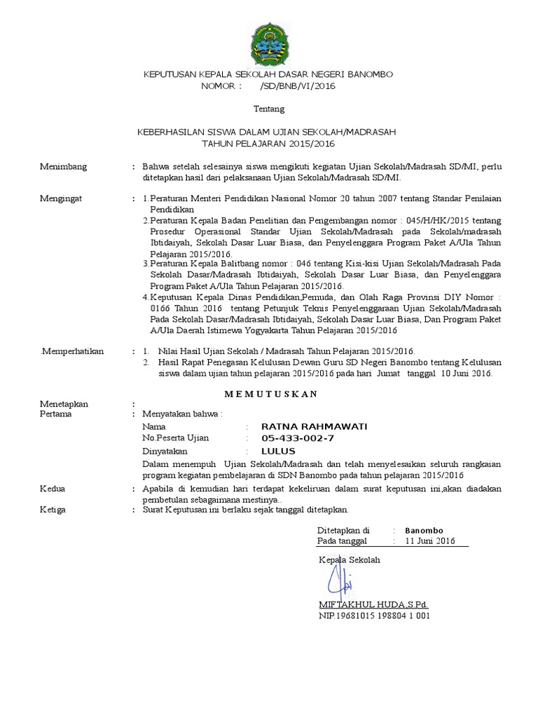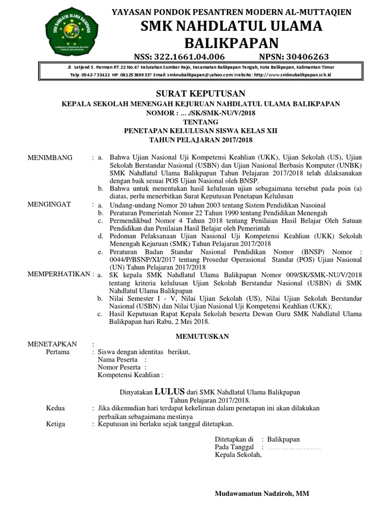 Download contoh sk surat keputusan kelulusan siswa sekolah tahun 2017 sk lulus ujian biasanya dibuat setelah pelaksanaan rapat telah digelar yang mana kegiatan rapat tersebut dilakukan untuk merundingkan untuk pengesahan dan penetapan kriteria kelulusan siswa, setelah penetapan dengan disepkati panitia rapat kelulusan maka guru kepala sekolah akan membuat sk lulus un untuk peserta didiknya contoh surat keputusan. Contoh surat keputusan kelulusan sekolah (sk kelulusan sekolah) majelis pendidikan dasar dan menengah.